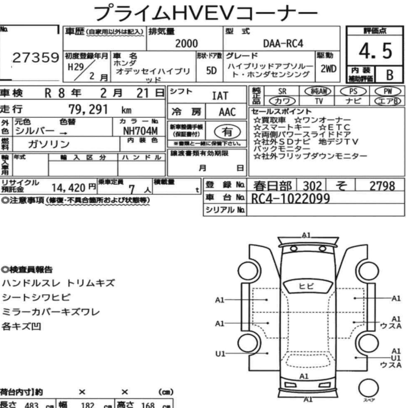 Grading reports or Japanese auction sheets are used to list the details of the vehicle and its condition. Reporting formats varies depending on the auction house that it was listed on, but generally the basic information remains the same.